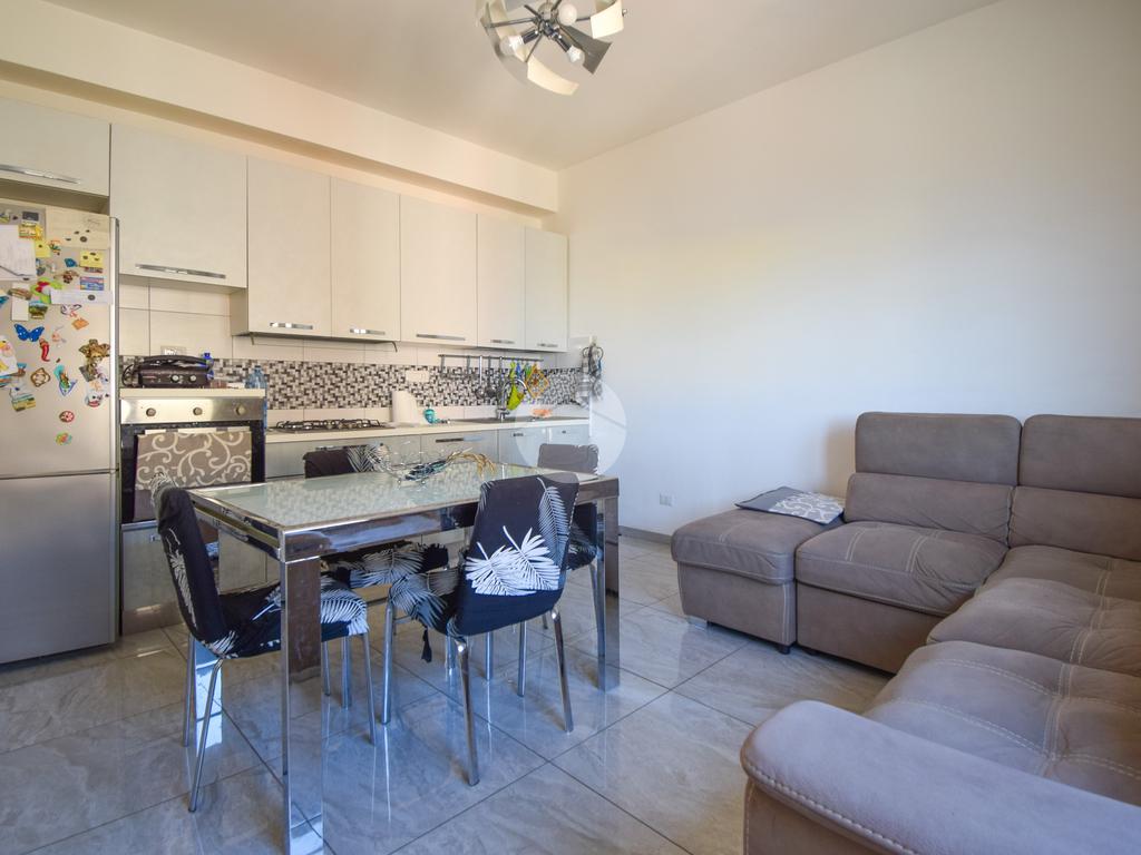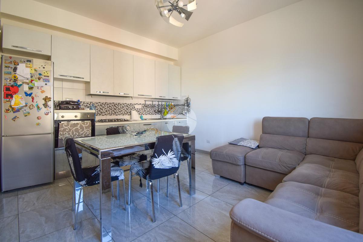 La zona living si apre con un soggiorno con angolo cottura, pratico e accogliente, illuminato da una grande finestra.